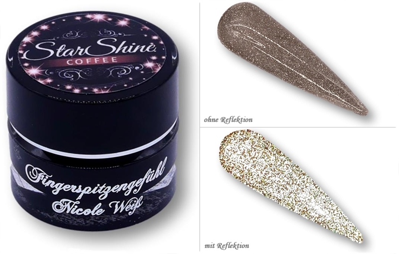Die StarShine Reflection-Gele sollten für einen einwandfreien Reflektions-Effekt zweimal dünn aufgetragen werden (nach der ersten Schicht 20 Sekunden aushärten, nach der zweiten Schicht 60 Sekunden aushärten). Die Gele sind hochdeckend (bei entsprechend vorbereitetem Untergrund) und bestechen durch ihren wunderschönen, funkelnden Reflection-Effekt bei entsprechendem Lichteinfall (wie z. B. Blitzlicht, Disco-Licht, LED-Licht bei Dunkelheit etc.)