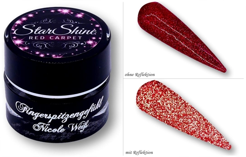 Die StarShine Reflection-Gele sollten für einen einwandfreien Reflektions-Effekt zweimal dünn aufgetragen werden (nach der ersten Schicht 20 Sekunden aushärten, nach der zweiten Schicht 60 Sekunden aushärten). Die Gele sind hochdeckend (bei entsprechend vorbereitetem Untergrund) und bestechen durch ihren wunderschönen, funkelnden Reflection-Effekt bei entsprechendem Lichteinfall (wie z. B. Blitzlicht, Disco-Licht, LED-Licht bei Dunkelheit etc.)
