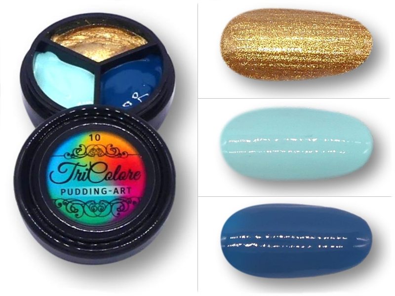 Variante 10: Mint, Gold, Petrol-Blau - drei cremige Farbgele in einem Tiegel mit höchster Deckkraft.