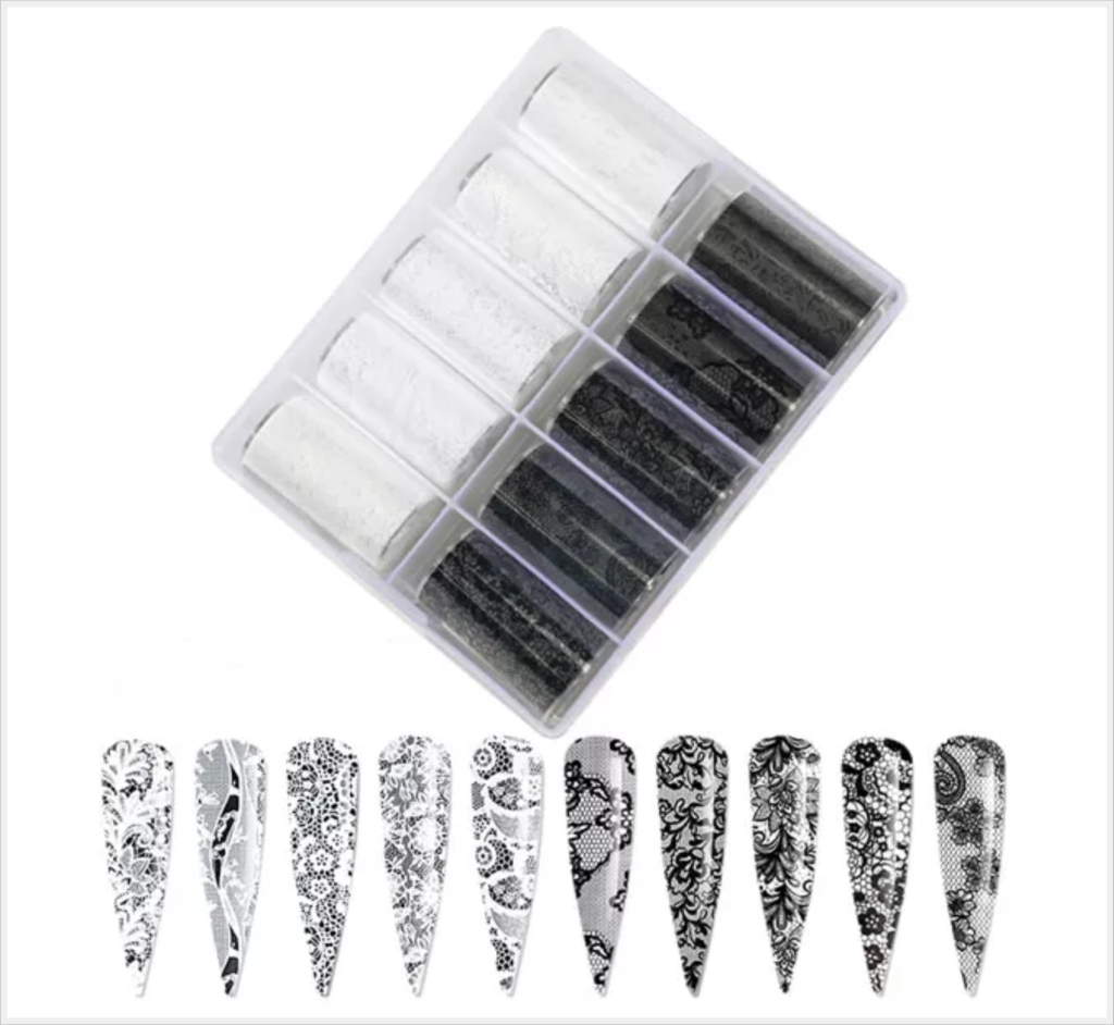 10 x Transferfolien (jeweils 5 x schwarz und weiß) mit feinsten Ornamenten und Spitzen-Designs.