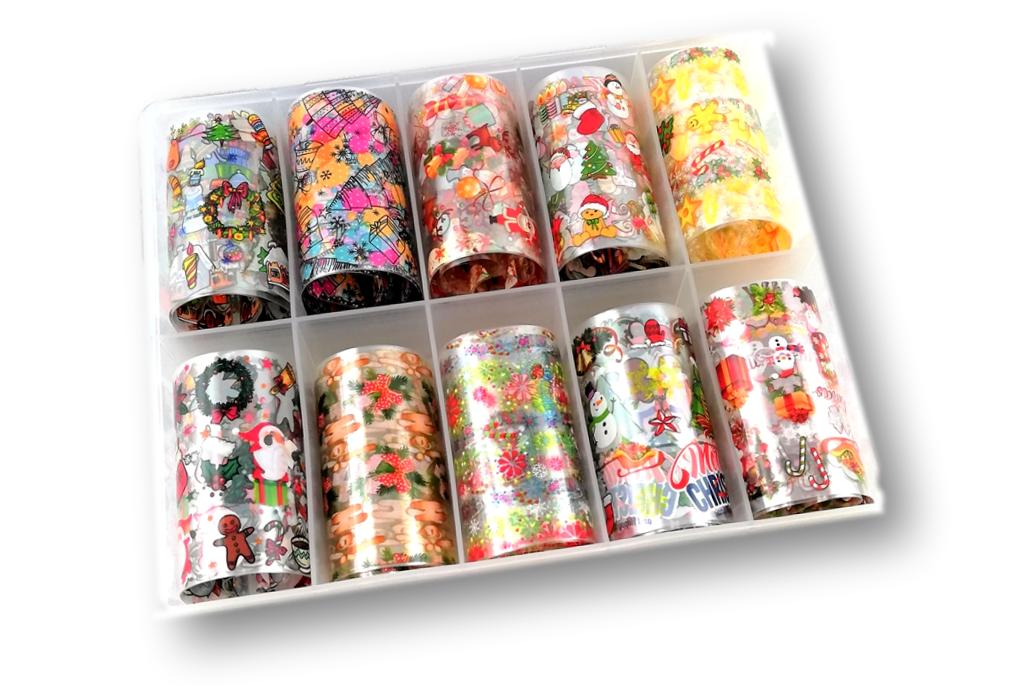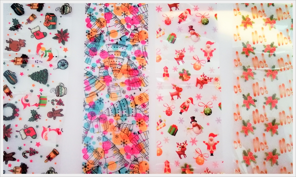 10 x Transferfolien mit bunten Weihnachtsmotiven. Die Folie ist transparent. Die darunter aufgetragene Farbe scheint durch.