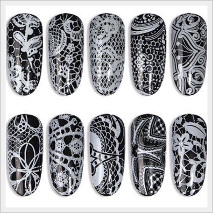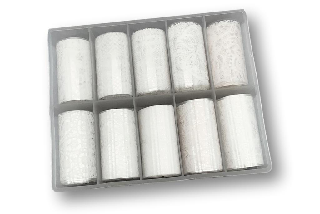 10 x Transferfolien mit feinsten Ornamenten und Spitzen-Designs. Die Folie ist transparent und somit scheint das aufgetragene Farbgel durch.