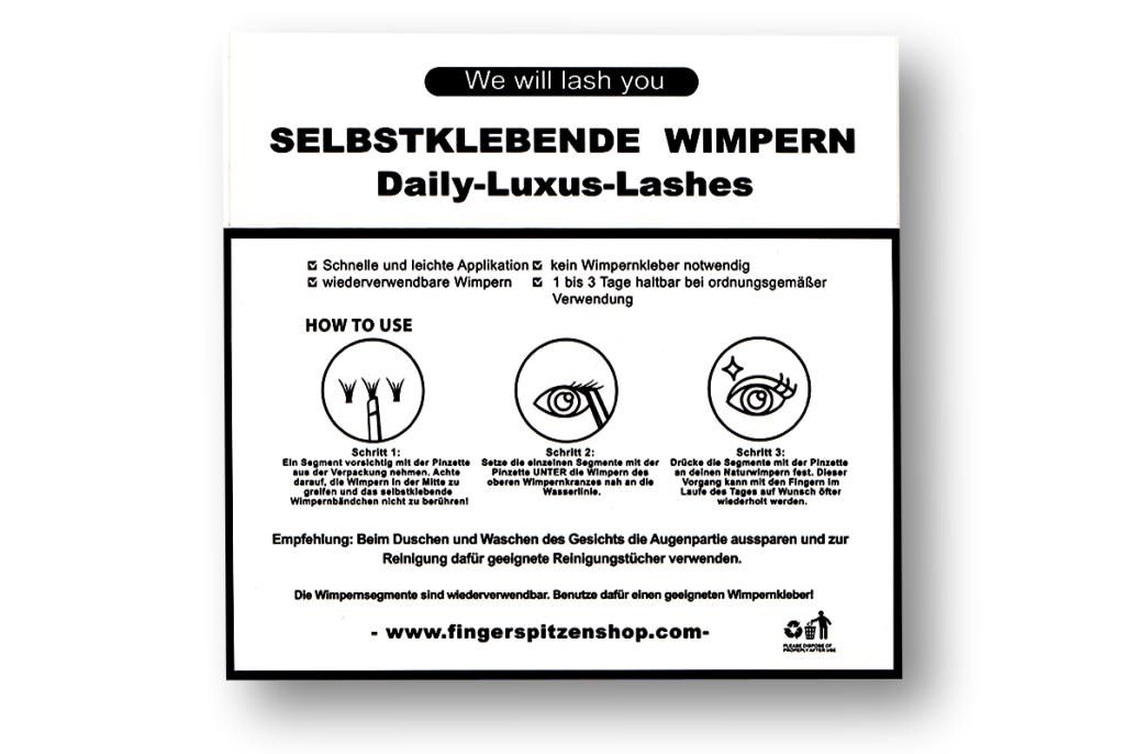 Die Daily Luxus-Lashes sind SELBSTKLEBEND! Der Kleber ist bereits auf dem Wimpernbändchen aufgetragen. Die Wimpernsegmente müssen somit nur noch mit einer Pinzette aus der Box genommen und von unten an den oberen Wimpernkranz angebracht werden.