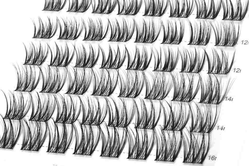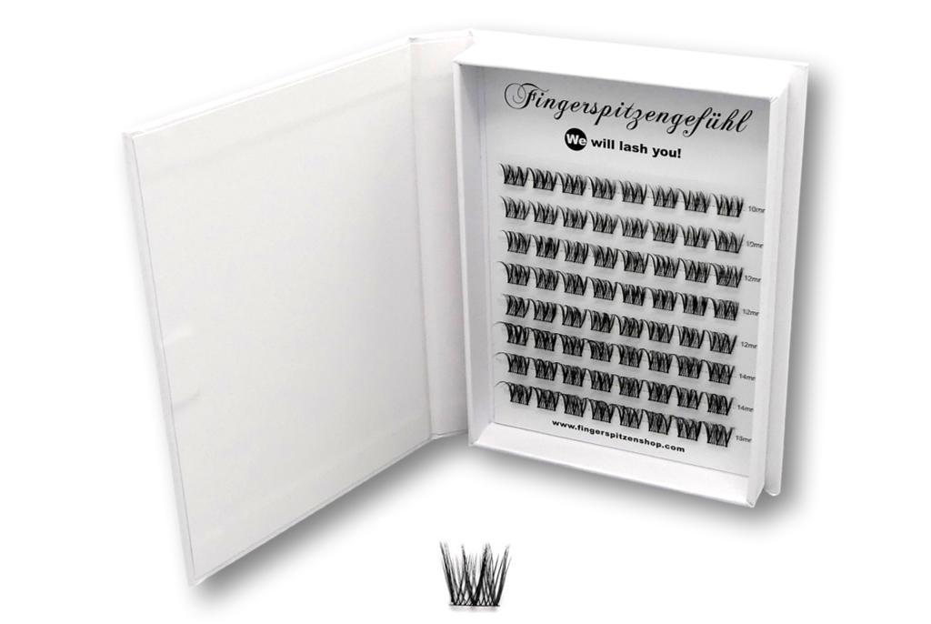 Lieferumfang pro Box: 2 Reihen mit 10 mm, 3 Reihen mit 12 mm, 2 Reihen mit 14 mm und eine Reihe mit 16 mm-langen Segment-Wimpern.