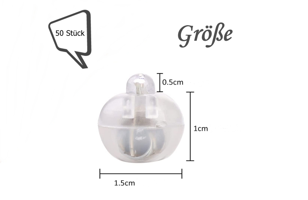 Lieferumfang: 50 Ambiente-Lights - Durchmesser ca. 1,2 cm (eine Kugeln enthält zwei LR41 Knopfbatterien), Leuchtdauer am Stück ca. 48 Stunden. Das Licht kann durch das kleine Trennblättchen wieder unterbrochen werden. Dazu wird das Trennplättchen einfach wieder in den Schlitz zurückgesteckt.