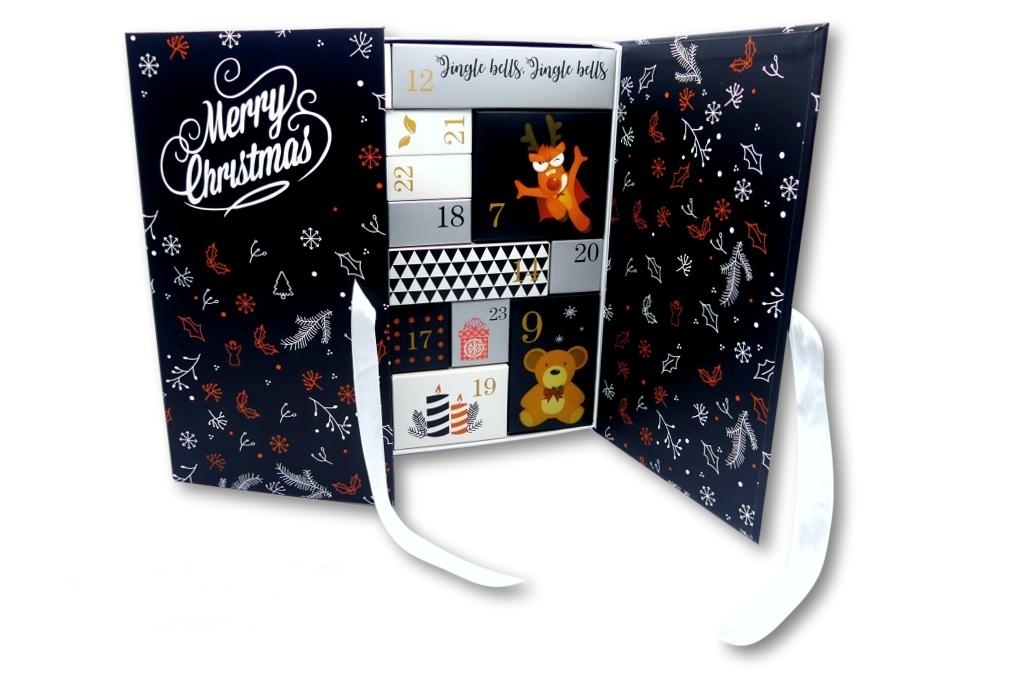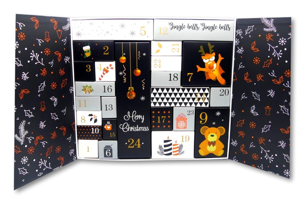 Die Kalender haben 24 verschiedengroße, numerierte Innenkartons mit diversen weihnachtlichen Motiven. Die Kalender sind nicht von uns personalisiert (kein Fingerspitzengefühl-Schriftzug) und können so mit allen erdenklichen Produkten / Süßigkeiten selbst befüllt werden.