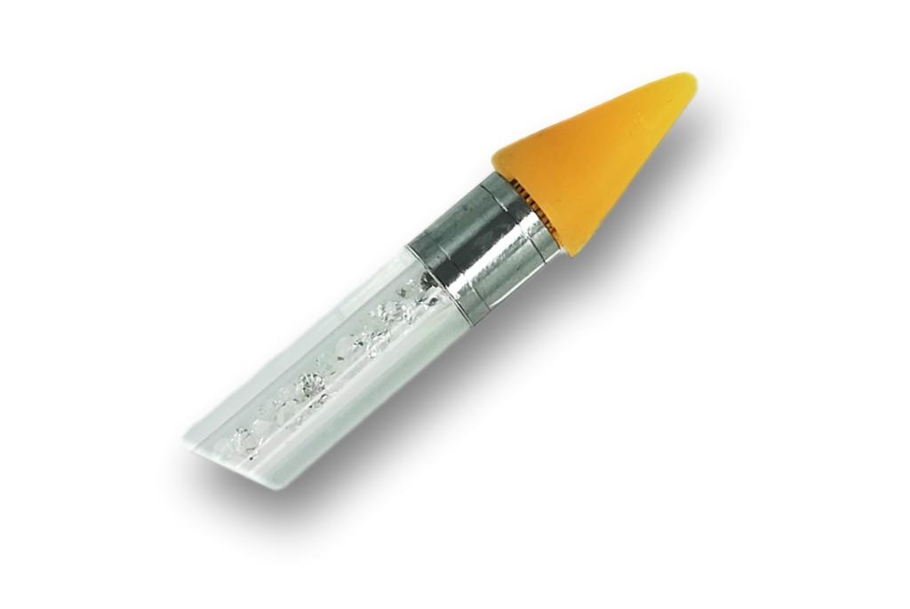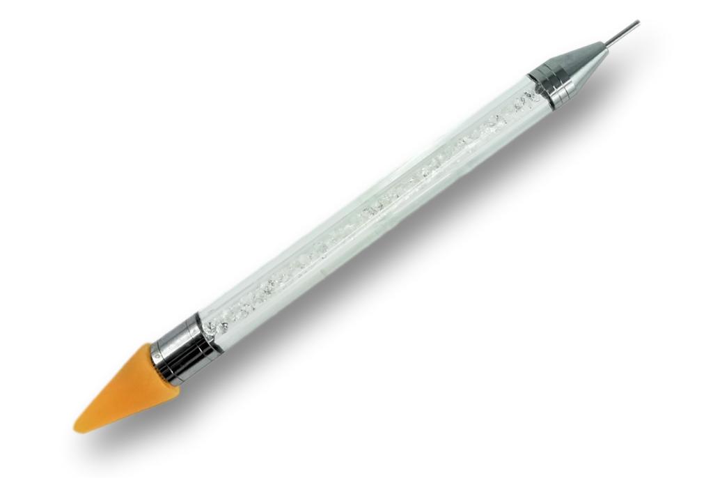 Mit der gewachsten Seite werden die Steine/Perlen etc. aufgenommen und auf dem Nagel abgesetzt, mit der silbernen Spitze werden die Steine bzw. Perlen genau an die richtige Stelle geschoben.
