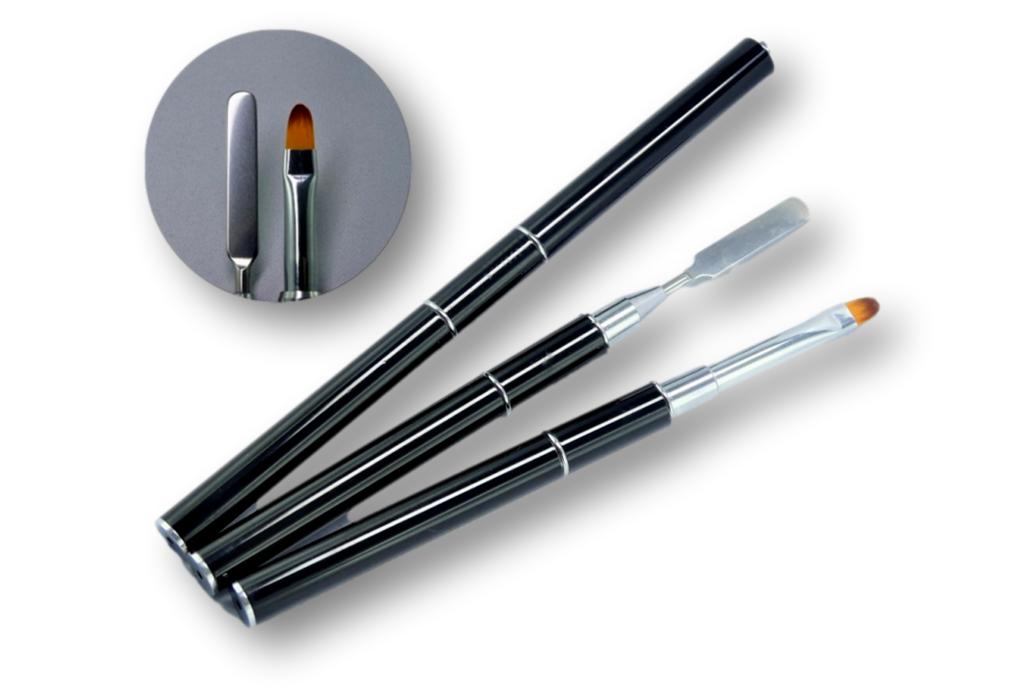 Er hat zwei Seiten - auf der einen Seite befindet sich ein Spatel (ca. 3 cm) lang zum einfachen entnehmen des Acrylgels. Auf der anderen Seite befindet sich der Pinsel aus Torayhaar *) (6 mm breit, 9 mm lang).Beide Seiten des Pinsels lassen sich mit einer Kappe verschließen. Neben der Zweckmäßigkeit des Pinsels sieht er auch noch sehr elegant aus und verfügt über eine gute Haptik.