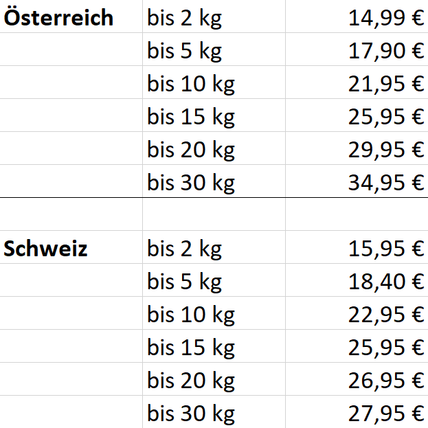 Für den Versand in diese Länder berechnen wir die folgenden Versandkosten, welche im Zuge Ihrer Bestellung anhand des Gewichtes automatisch vom System errechnet werden. Sie enthalten bereits die Mehrwertsteuer.